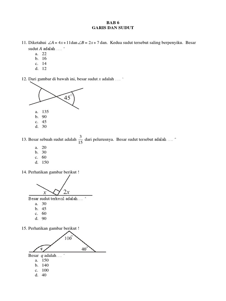 Besar sudut x dari gambar di bawah ini adalah. C a 5x d b 3x 4x 2x e 3x 4x 3 Di dalam lingkaran yang berdiameter 20cm terdapat sebuah juring dengan besar sudutpusat 450. 3 Dua buah vektor kecepatan P dan Q masing-masing besarnya 40 ms dan 20 ms membentuk sudut 60. Modus dati data tersebut adalah.