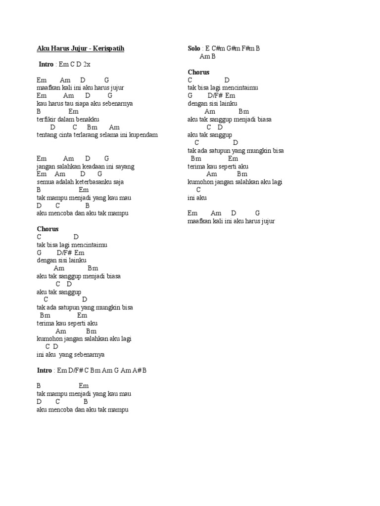 Aku tak Sanggup Lagi A D menerima Derita ini G D Aku tak Sanggup lagi A D G D-A-D A menerima Semuanya. F Aku tak sanggup C lagi G menerima derita C ini F Aku tak sanggup C lagi G menerima C semuanya F. Chord Kunci Gitar dan Lirik Lagu Tentang Sebuah Kasih Kerispatih.